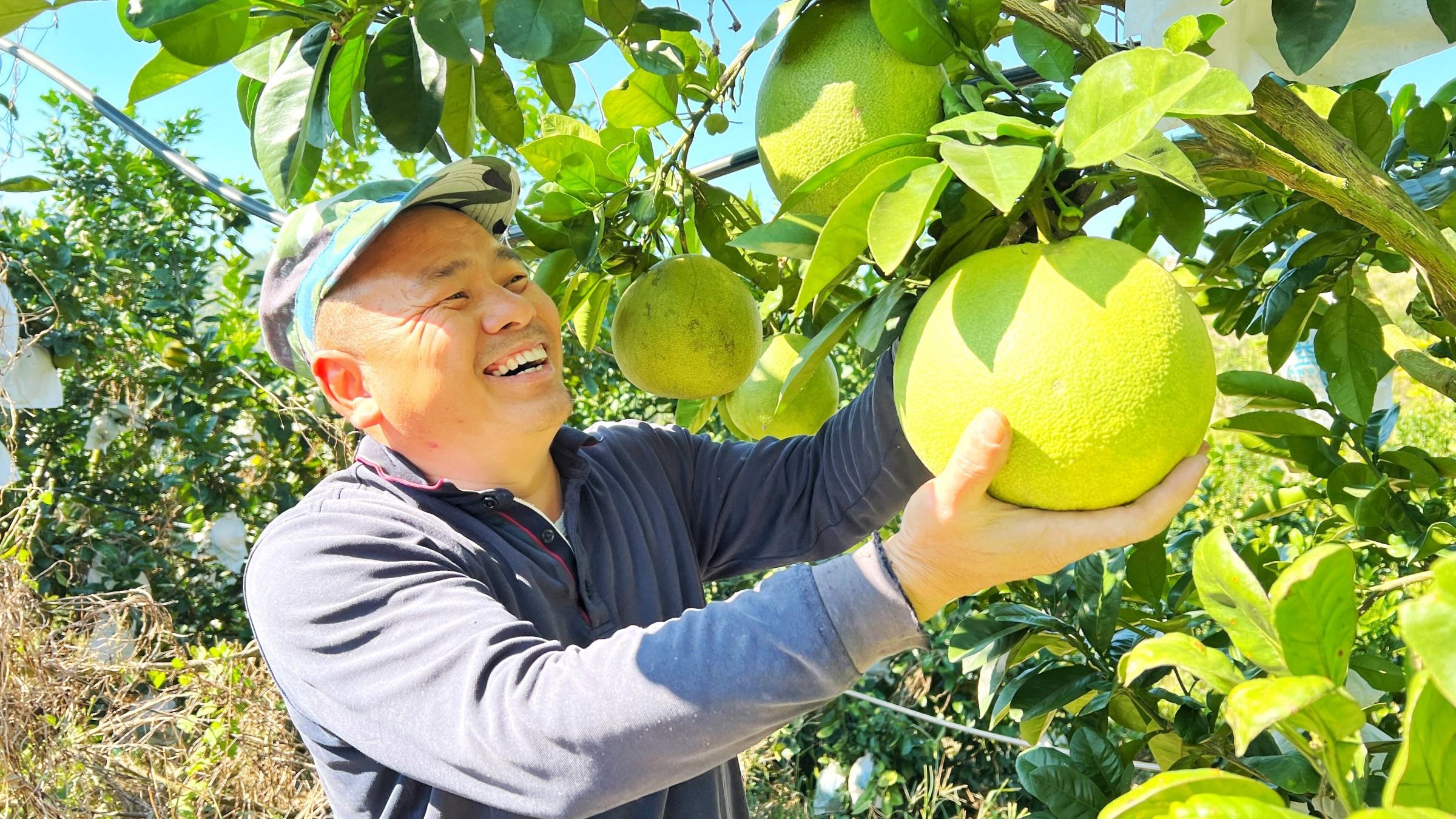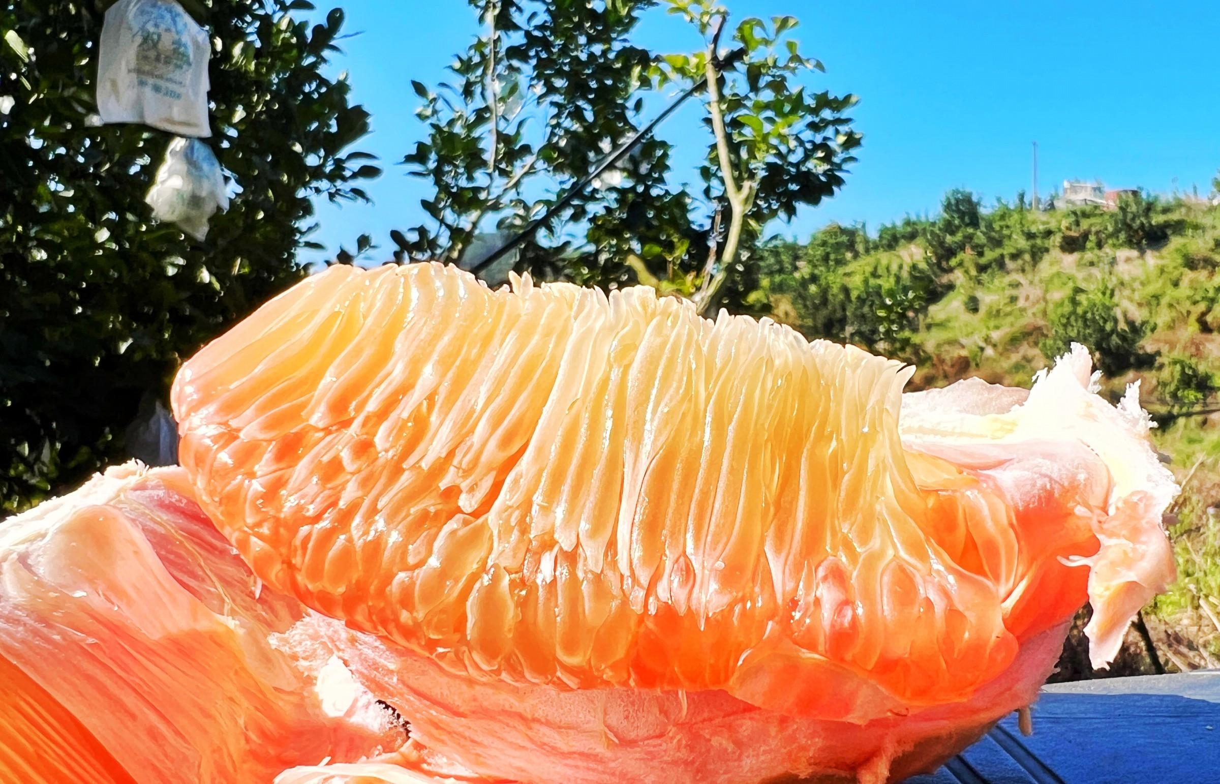 泰國青柚的種植并非易事,但肖志才憑借著對市場的敏銳洞察和不懈努力,逐漸掌握了這套“綠色密碼”。這種原產泰國的短球形柚子,果肉粉紅,糖度高達15-16度,較國內柚類更甜潤多汁,且內膜無白化現象,耐貯運性強。更令肖志才看重的是其超長采摘期——從11月可持續到次年4月,完美避開傳統蜜柚的集中上市高峰,市場行情穩定,價格優勢顯著。 “對面那一片山,是我原來的傳統蜜柚的種植基地,今年柚子行情不太好,基本在1塊錢1斤,我想過完年后,把一片山的傳統蜜柚也嫁接成泰國青柚。”肖志才說,“這不僅是為了提高收益,更是響應黨的二十屆四中全會關于分類推進鄉村振興、促進城鄉融合發展的號召,通過產業結構調整,既能延長產業鏈條,提升農產品附加值,又能帶動周邊村民就業,實現‘家門口’增收。”