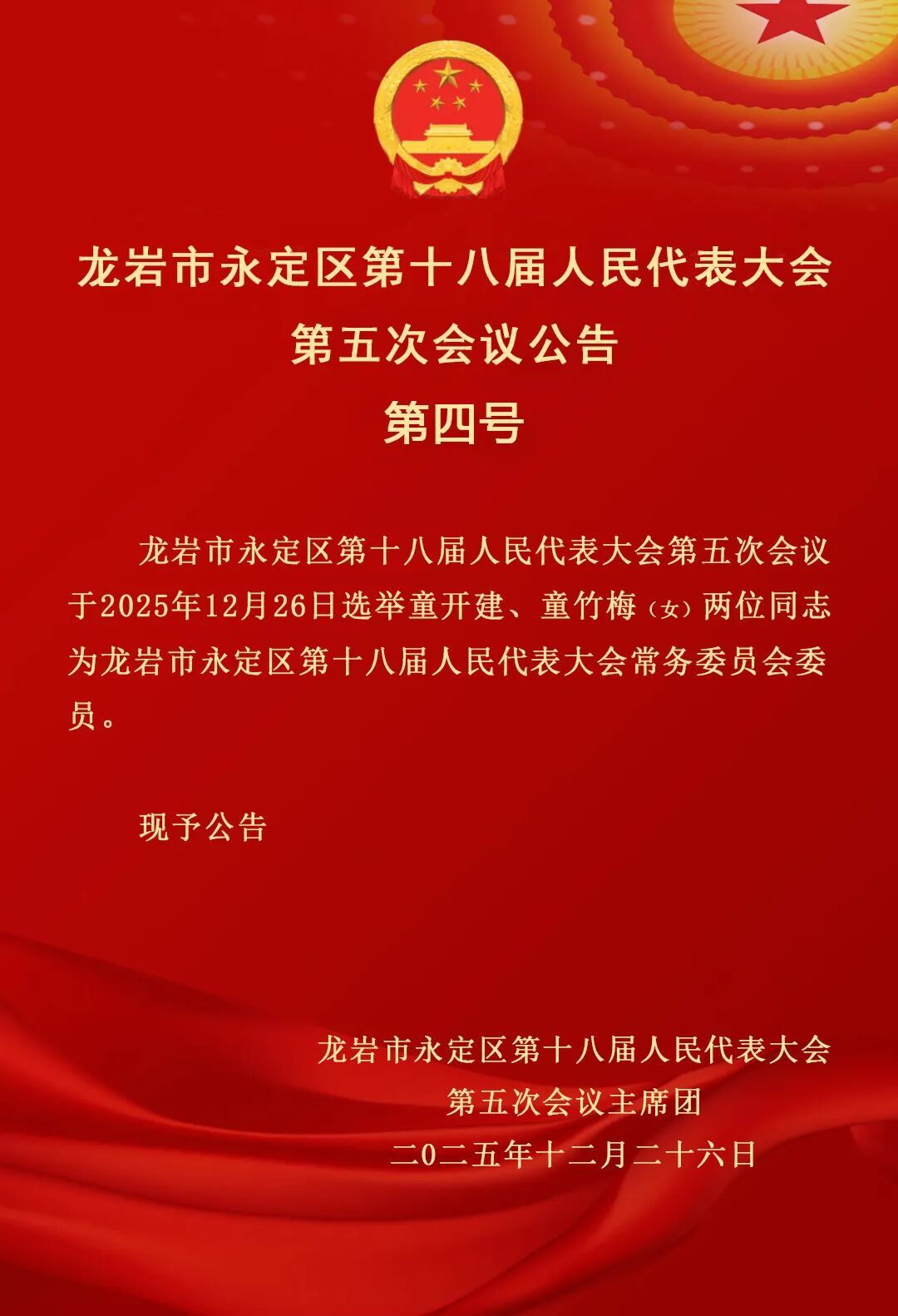 龍巖市永定區第十八屆人民代表大會第五次會議公告(第四號)