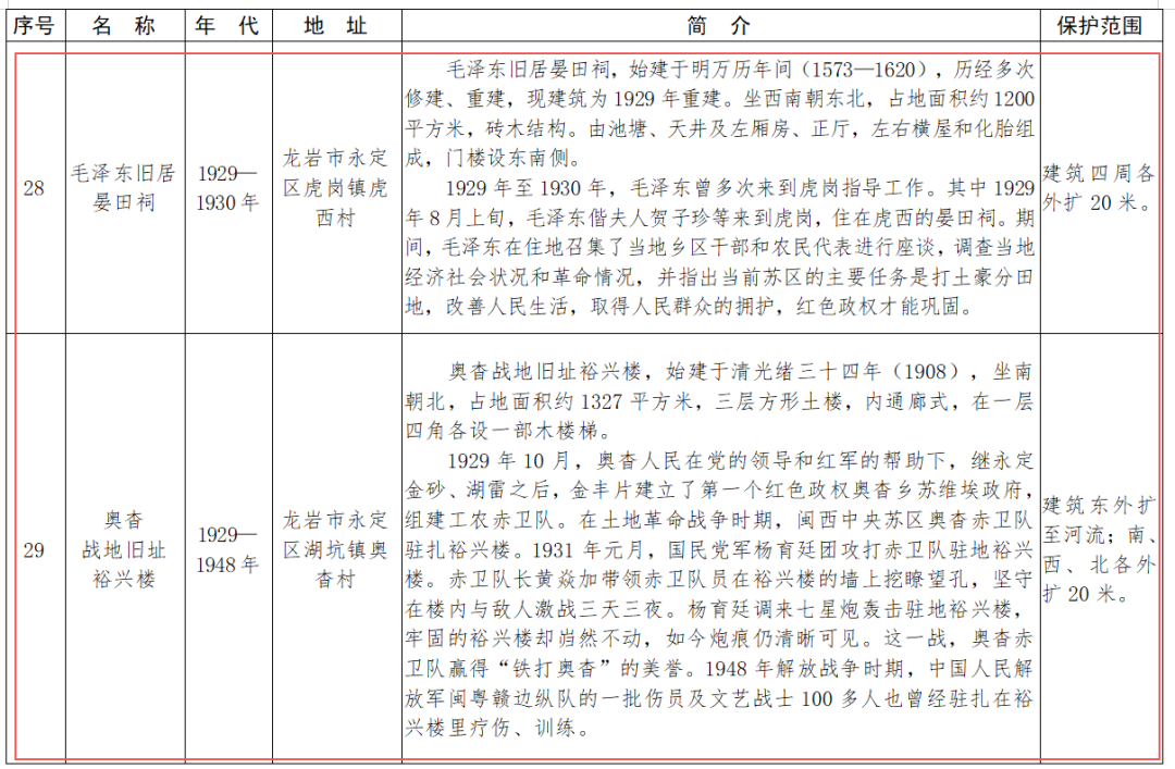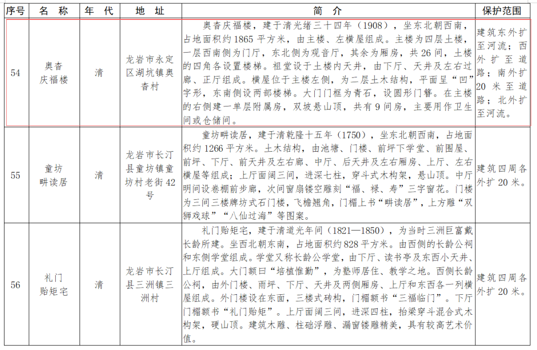 據(jù)悉,此次公布的“省保”單位涵蓋古遺址6處、古墓葬8處、古建筑63處、古石刻及造像8處、近代重要史跡及代表性建筑45處、其它1處、擴(kuò)展項(xiàng)目2處。其中,永定區(qū)湖坑鎮(zhèn)奧杳村“慶福樓”被列入古建筑類;永定區(qū)湖坑鎮(zhèn)奧杳村“奧杳鄉(xiāng)蘇維埃政府舊址‘裕德樓’”、永定區(qū)虎崗鎮(zhèn)虎西村“毛澤東舊居‘晏田祠’”、永定區(qū)湖坑鎮(zhèn)奧杳村“奧杳戰(zhàn)地舊址‘裕興樓’”、永定區(qū)洪山鎮(zhèn)尚徑村“廖成美將軍祖居尚徑‘承蔭樓’”等4處被列入近代重要史跡及代表性建筑。