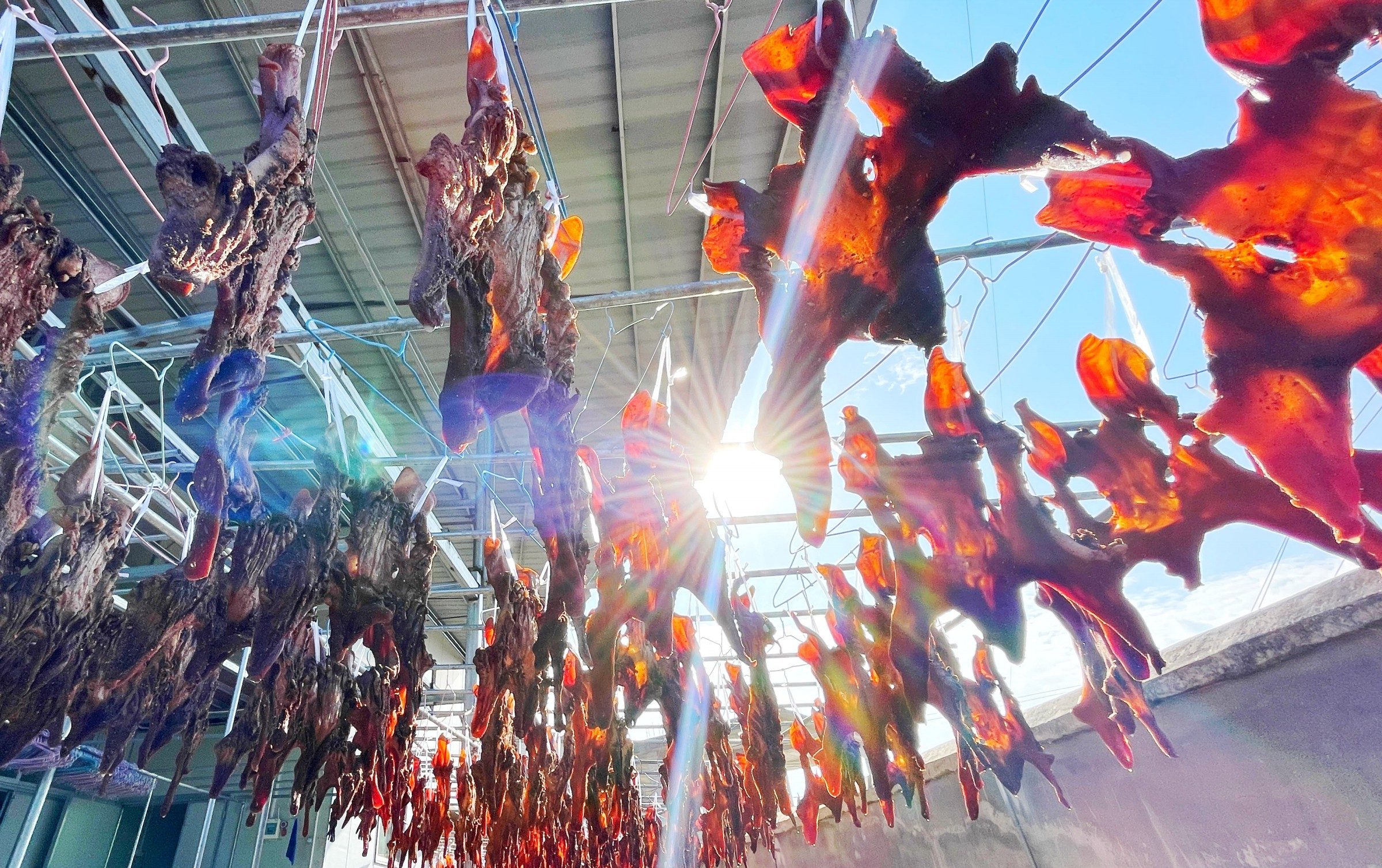 作為當地小有名氣的臘味手藝人,張福光對這門手藝有著獨到的鉆研。22年前,他便開始琢磨如何將食材中的下腳料變為餐桌上的珍饈。經過反復試驗,他秘制出了一套專門腌制豬頭皮的香料配方。不同于傳統的煙熏,張福光的作坊里既保留了借助自然風和太陽光風干的古法工藝,也引入了現代電烤爐進行輔助烤干。這一過程不僅讓豬頭皮變得緊實有嚼勁,更賦予了其獨特的風味,成為永定臘味中的一絕。