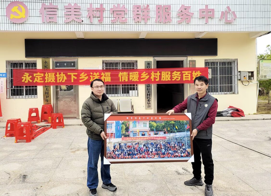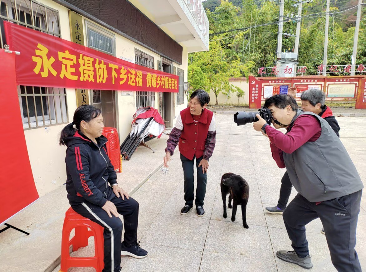 攝影師為老人拍攝照片,村民在一旁逗樂老人。 “大伯,您坐直一點。”“阿婆,您再笑一笑。”在為60歲以上村民免費拍攝單人肖像活動現場,攝影師耐心細致地引導老人調整姿勢、整理衣物,時而輕聲交談緩解緊張情緒,時而用俏皮話逗笑現場村民,隨著“咔嚓咔嚓”的快門聲響,一張張燦爛的笑臉在鏡頭里定格,一個個溫馨幸福的瞬間被記錄下來。攝影師用打印、裝裱、裝框設備現場制作精美的照片贈送給村民,提前為他們送上暖暖的新春祝福。“太感謝你們了。這是我這幾年來最滿意的一張照片,把我拍得好像年輕了二三十歲。”一位村民剛剛拍照片,便迫不及待地去看電腦里的相片,連聲稱贊拍得好。 “能用自己的一技之長為村民做點有意義的事,心里很高興。”永定區攝影家協會主席溫學元還將自己去年拍攝“信美村全村福”照片放大,將這張承載著濃濃鄉情和幸福瞬間的巨幅合照送給村委會,“一張‘全村福’,記錄的是鄉里鄉親的和諧,把全村人的心都凝聚在了一起。”