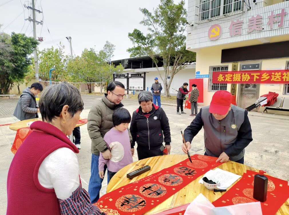 視頻加載中... 光影傳情 筆墨送福。2月7日,永定區攝影家協會組織10幾名骨干會員組成“文藝輕騎兵”志愿服務隊,深入峰市鎮信美村開展“下鄉送福 情暖鄉村 服務百姓”公益活動,以鏡頭定格笑臉,用筆墨書寫祝福,為村民們送上了一份飽含溫度的“文化年貨”。